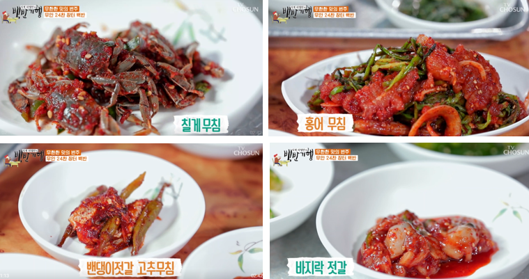 칠게 무침, 홍어무침, 밴댕이 젓갈 고추무침, 바지락 젓갈 등 남도의 특색이 묻어나는 반찬들